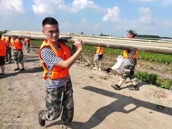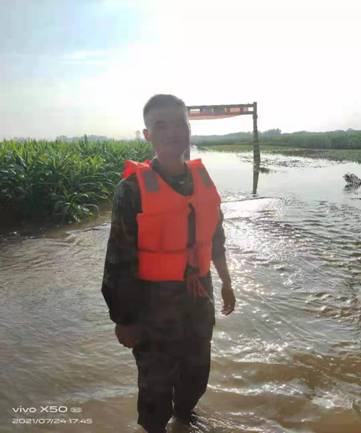 实习期间的蒋海洋退伍不褪色,始终把人民群众生命安全放在第一位,在郑州720特大暴雨灾情中不畏艰险,冲锋在前,积极加入到由退役军人组建的抢险救援队伍中去,配合政府转移群众,安置人员,受上游泄洪影响,贾鲁河聂堆镇鲤滩村段存在溃堤险情,接到西华县应急管理局加固堤坝的指示后,冒着暴雨,7月23凌晨3点多蒋海洋同学随抢险队紧急赶到该低洼河提处装运沙袋构筑防洪堤坝,一刻不停的扛着沉重的沙袋蹚着过膝的雨水干到下午18点多,在换岗队伍刚到准备休整时,接到武装部通知附近有漫滩点出现,需要紧急前往抢险,已经从凌晨连续作战14个小时的蒋海洋顾不上休息,发扬不怕苦累,不畏艰险连续作战的军人作风,再次投入抗洪抢险中去,赶到漫滩点后,他们配合大型机器紧急修筑新的防线,直至凌晨5点多修筑起一道三公里多的堤坝。