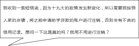 近日,有地方反映,个别学校的学生接到诈骗电话,内容是:党的十九大以来政策发生变化,已申请的贷款账户需要注销,需要按照对方说的程序进行操作,否则会产生不良的影响。以上是新的诈骗手段,接到电话的学生中,有办理贷款的,也有没有办理贷款的学生。请大家务必提高警惕,避免上当受骗!目前,国家助学贷款没有政策变化。今后,还请同学们相信正规渠道的信息,有困难和疑问要找学校和班主任。