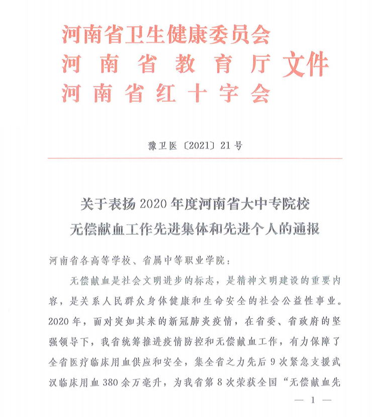 近日,河南省卫生健康委员会、河南省教育厅、河南省红十字会联合印发《关于表扬2020年度河南省大中专院校无偿献血工作先进集体和先进个人的通报》,对2020年度,特别是2020年新冠疫情防控期间,为满足临床医疗用血需要,踊跃参与无偿献血的80个集体和180名个人,授于“先进集体”、“先进个人”荣誉称号。我校荣获“无偿献血先进集体”,教师郑直荣获“无偿献血先进个人”。以上荣誉的获得,是对我校弘扬“奉献、友爱、互助、进步”的志愿服务精神的肯定,也是对我校在无偿献血工作方面的认可和鼓励。