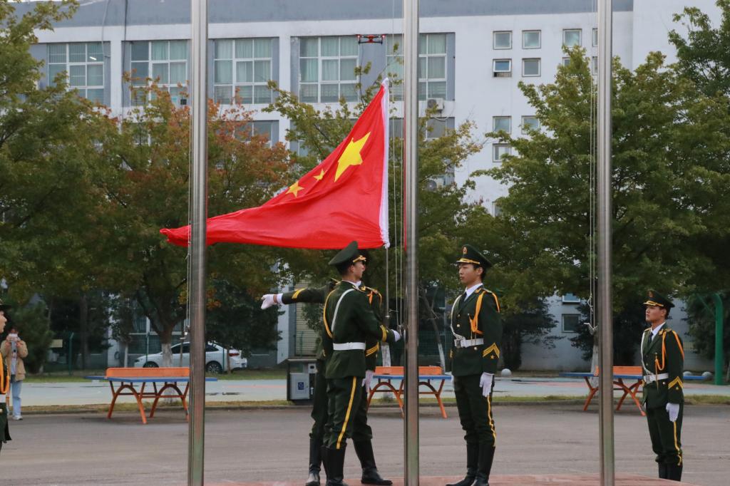 早上7时,伴随着雄壮的《义勇军进行曲》,师生高唱国歌,鲜艳的五星红旗冉冉升起,迎风飘扬,现场气氛庄严肃穆。