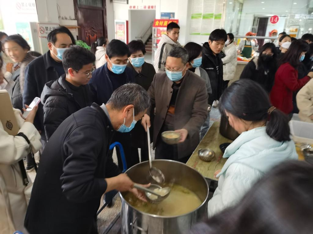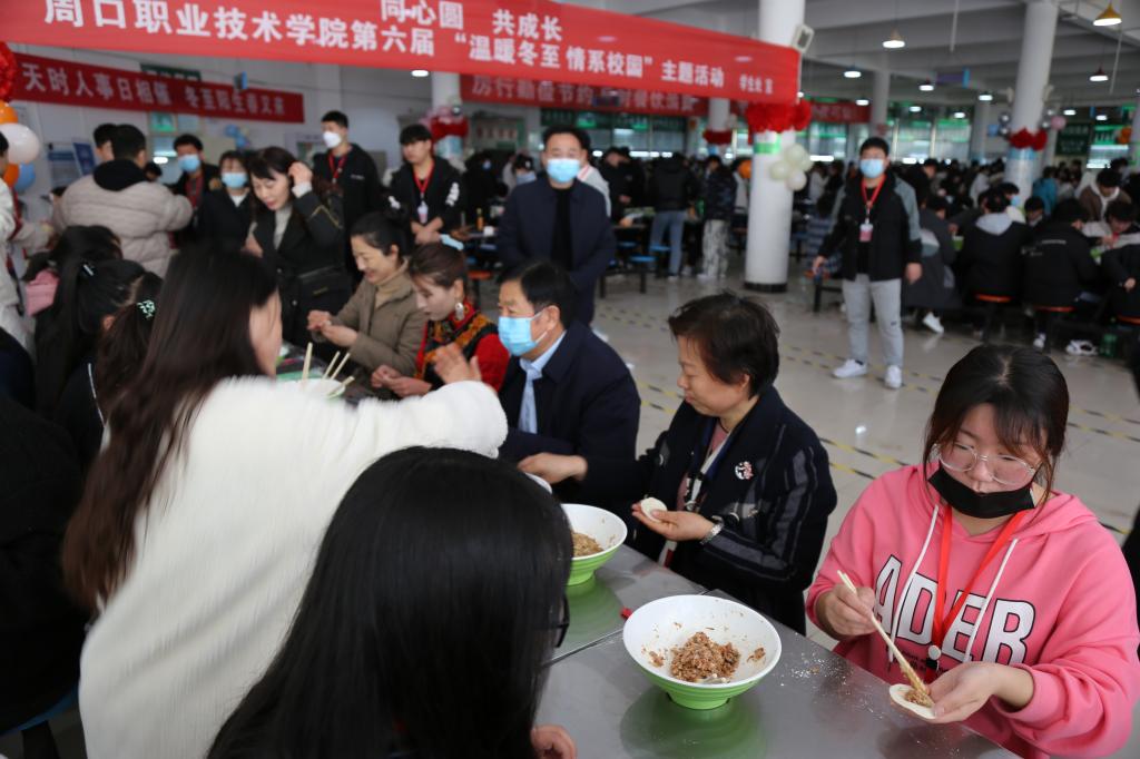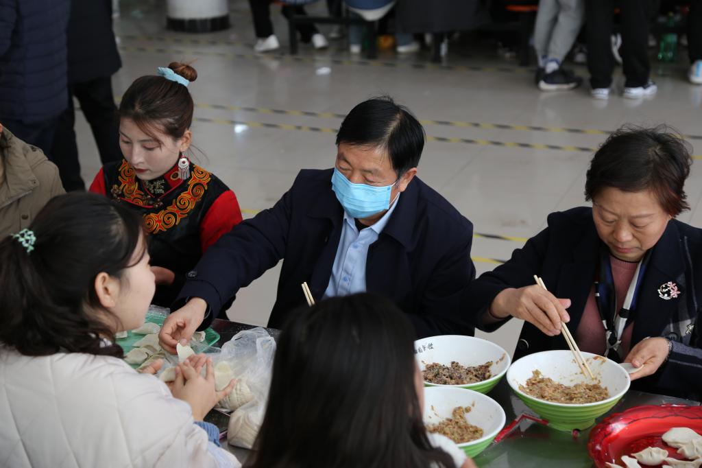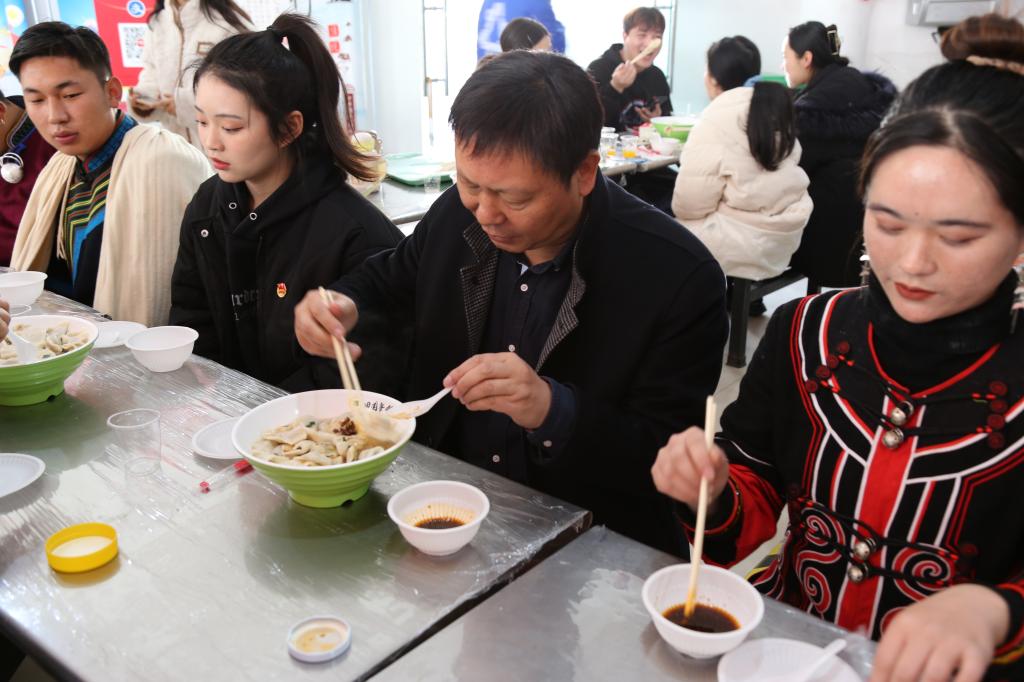 伴随着大家的欢笑声,热腾腾的饺子出锅了。校领导为学生们盛上一碗香气四溢的鱼汤,师生们围坐在一起一边喝着鲜美的鱼汤一边品尝自己的劳动成果,边吃边谈,校领导们殷切嘱托同学们要深入贯彻文化自信,不断学习、弘扬和继承中华民族优秀的传统文化,爱上传统文化,拒过“洋节日”。现场气氛和谐,到处体现着“家”的温馨,让这个冬日格外温暖。