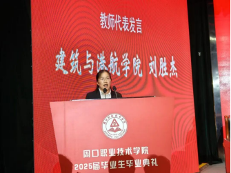 教师代表建筑与港航学院院长刘胜杰教授带着对教育的热忱和对同学们的期许,为毕业生们送上珍贵嘱托和真挚祝福。她表示,当大家迈入职场,“周职学子”的标签会沉淀为“大国工匠”的后备力量,在这奔赴山海的启程时刻,送给2025届毕业学子“永动的学习引擎、永恒的匠者之心、不熄的勇者之光”三把叩响未来的“金钥匙”,愿大家胸有凌云志,无高不可攀。